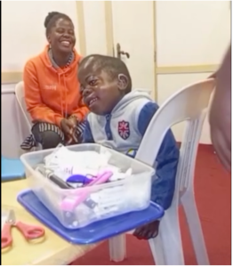Mugisha came to the clinic as a two-year-old and was diagnosed with severe bilateral hearing loss. He had no speech at all. We obtained hearing